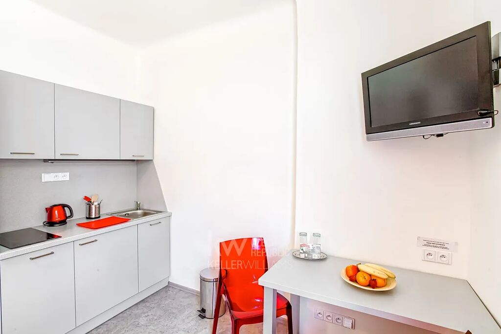 V krásné prvorepublikové vile k pronajme plně vybavené studio hned vedle parku a divadla Na Jezerce. Studio je vybaveno kuchyňskou linkou včetně lednice s mrazákem, varnou deskou a základním kuchyňským vybavením (příbory, talíře atd.). V koupelně je sprchový kout, WC a fén. Samotný pokoj je vybaven šatní skříní, televizí se satelitním příjmem, WIFI připojením, stolem, židlemi a postelí.