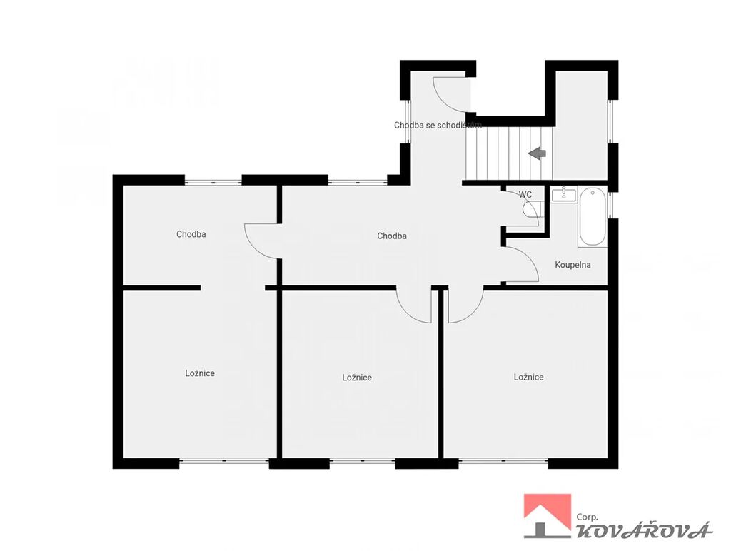Patro: tři samostatné pokoje, koupelna s vanou, samostatné WC, schodiště a vstup na půdu.