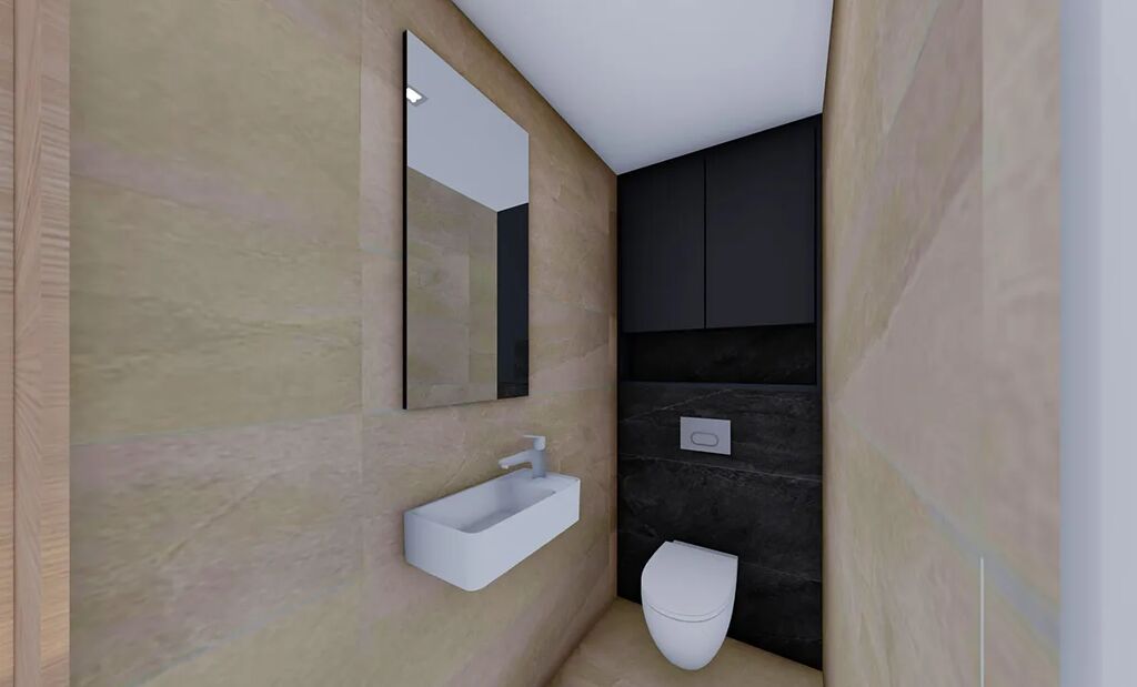 1. podzemní podlaží (1. P.P): dvě ložnice s vlastními šatnami, koupelna s WC a další terasa orientovaná na jihovýchod do zahrady s výhledem na les.