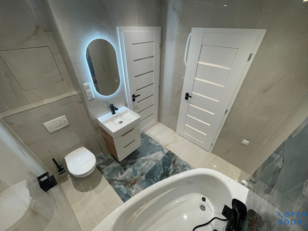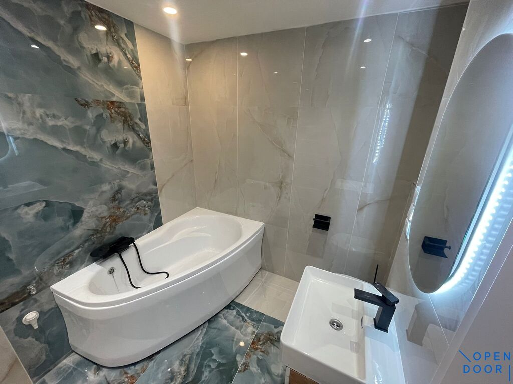 Koupelna je obložena designovým keramickým obkladem. Disponuje vanou, závěsnou toaletou a umyvadlovou skříňkou se zrcadlem vč. LED podsvícení.