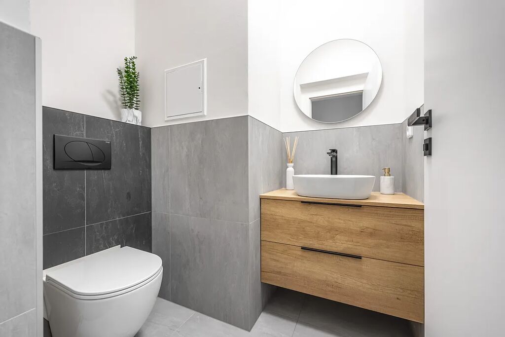- nová sanita (vana, sprchový kout, umyvadlo, skříňka, zrcadlo, toaleta s umyvadlem a skříňkou, , žebřík)