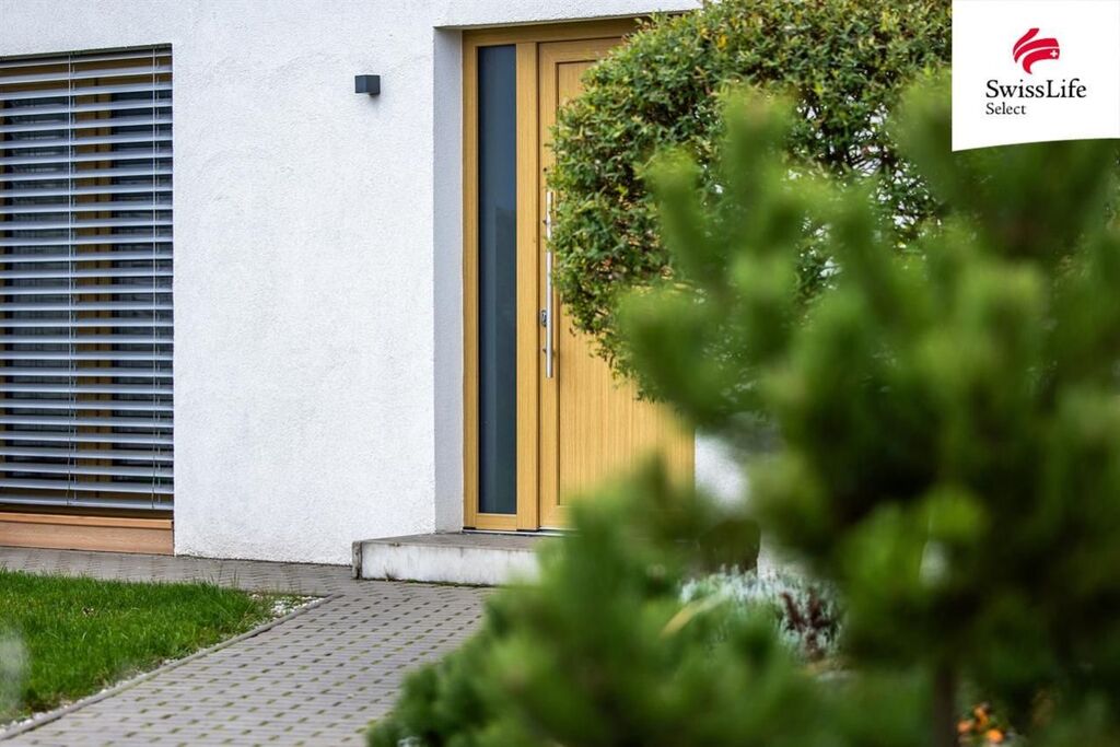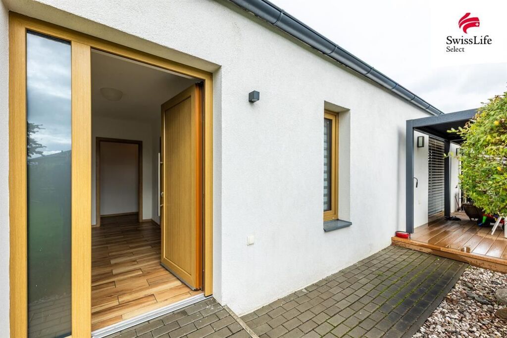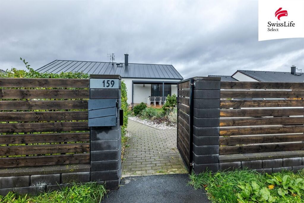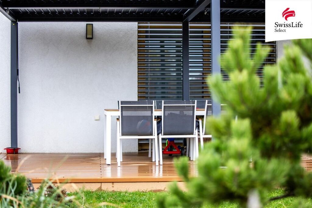 Exteriér tvoří WPC terasa 40 m s hliníkovou bioklimatickou pergolou, hotové terénní úpravy, chodníky a parkovací stání pro 2 auta. Na pozemku jsou dva zahradní domky a betonový plot (70 m) doplněný okrasným plotem z tvarovek a sibiřského modřínu.