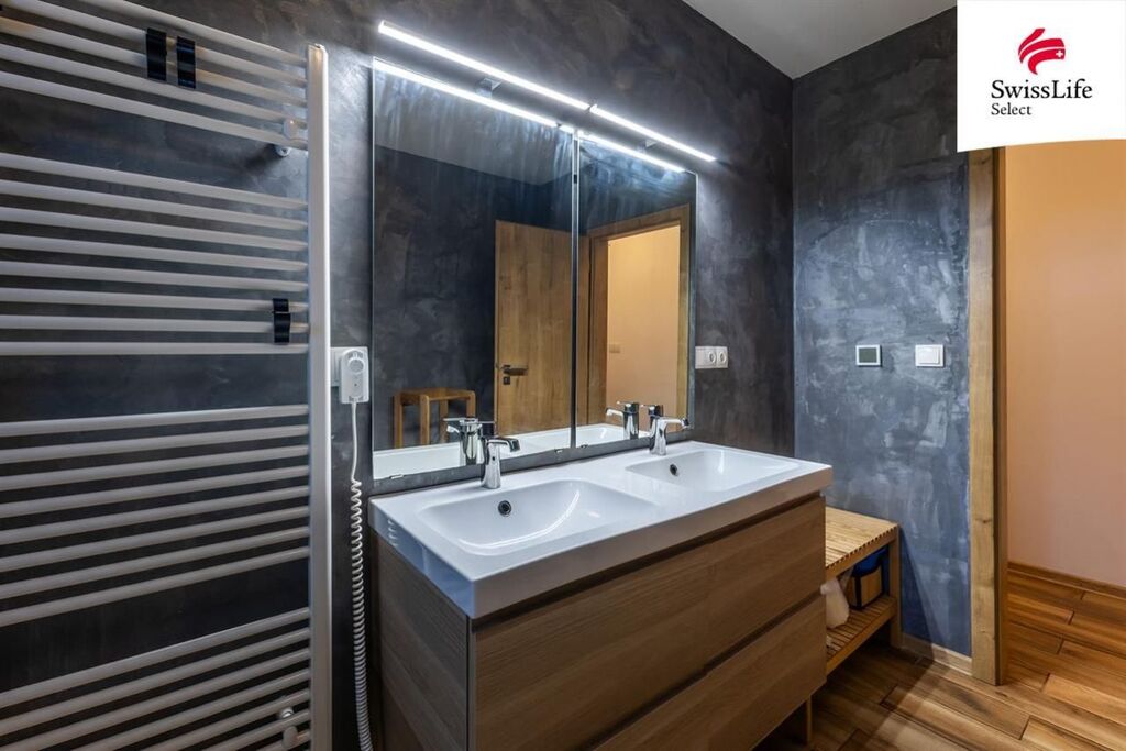 Dům disponuje elektrickým podlahovým vytápěním s termostaty v každé místnosti, nízkoenergetickým krbem (prémiová česká značka, 90 000 Kč) a spadá do energetické třídy B velmi úsporný provoz, náklady cca 4 500 Kč/měs. Voda je z vlastního 50 m hlubokého vrtu, kanalizace je veřejná. Dům se prodává kompletně zařízený, s dvěma koupelnami (větší s vanou, menší technická, obě se záchodem).