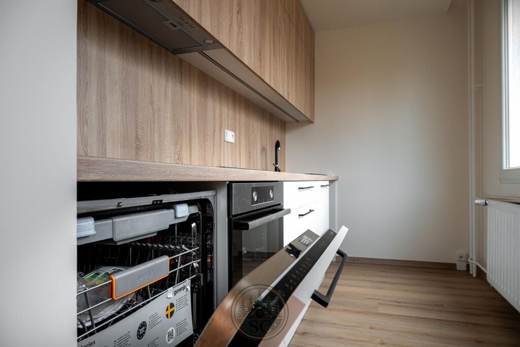 Kuchyňská linka i vestavná skříň jsou na míru od truhláře - kvalitní zpracování, přírodní odstíny a moderní linie dávají bytu příjemný a harmonický charakter. V kuchyni najdete zcela nové spotřebiče Gorenje - myčku, troubu a varnou desku, a také připravený prostor pro pračku.