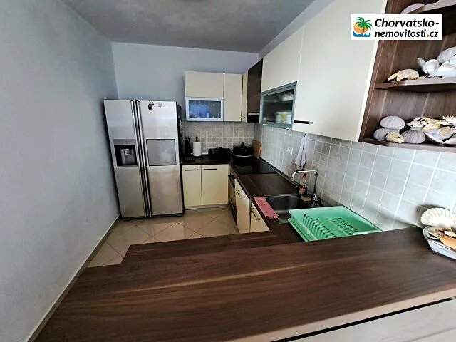 Chorvatsko-Nemovitosti.cz nabízí prostorný zařízený apartmán 2+1 o rozloze 42m2. Je vkusně vybavený a připravený pro nového majitele. Před apartmánem je prostorná zahrada s cestou přímo k moři. Apartmán má prostorný, krytý balkón na který si můžete dát posezení a užít si ranní snídani s výhledem na moře. Pláž je písčitá s kamínky, občas pouze kamínková. Podrobně o apartmánu: