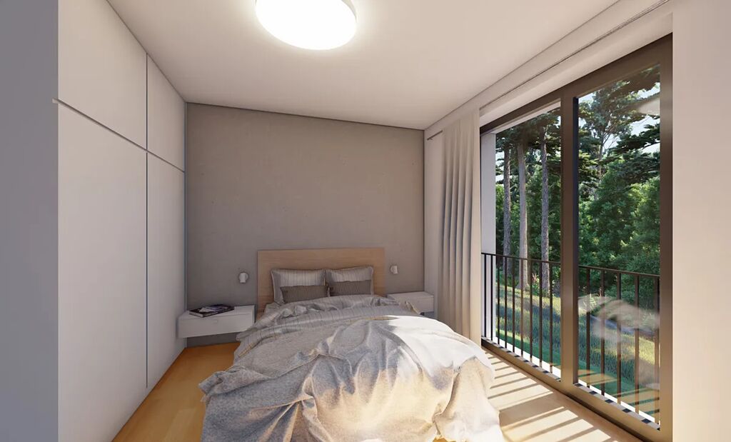 V 1.P.P jsou dvě ložnice se šatnami, koupelna a WC. Na ložnice navazuje terasa orientovaná jihovýchodním směrem do zahrady s výhledem na les.