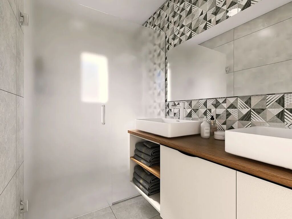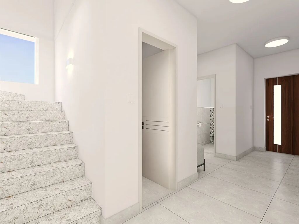 V horním patře je druhá jednotka: obývací pokoj s kuchyňským koutem, ložnice se šatnou, menší pokoj a koupelna s WC. Dispozice se domu se dá ale předělat k potřebám každého a je možné z něj tak vybudovat nový domov pro jednu rodinu.