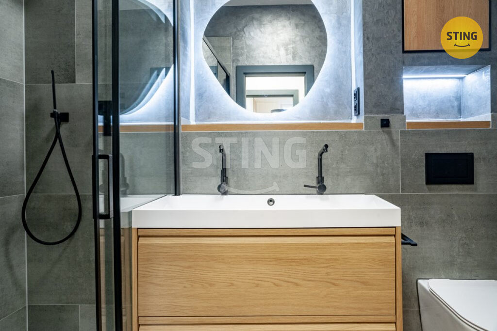 Jedním z hlavních prvků tohoto bytu je elegantní koupelna s italskou stěrkou, která podtrhuje celkový nadčasový a sofistikovaný vzhled interiéru. Nechybí ani dostatek úložného prostoru díky velkým vestavěným skříním, které jsou chytře zakomponované do dispozice bytu a nenarušují jeho čistý design.