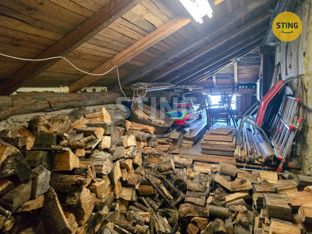 • Přízemí: obývací pokoj, ložnice, kuchyň, koupelna s WC, skladovací prostory, dřevník, schodiště do patra.