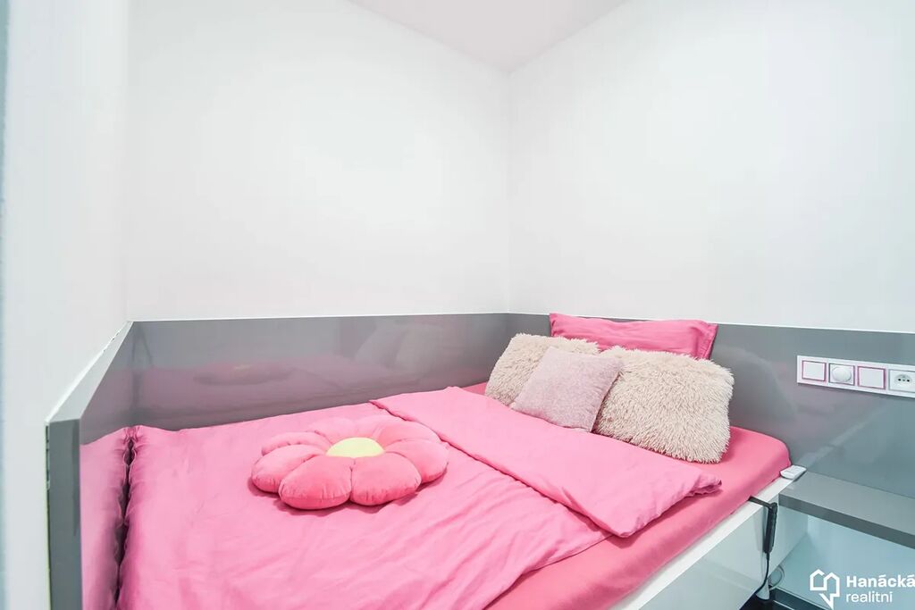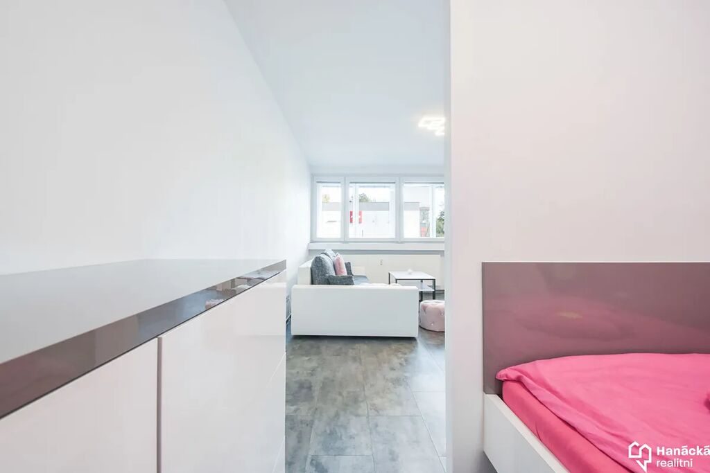 Byt je moderně a vkusně vybavený, postel je šikovně oddělená od obytné části, takže tu máte dostatek soukromí i prostor pro relax i práci.