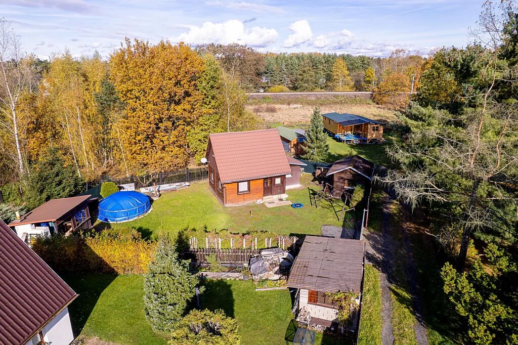 Na zatravněném a udržovaném pozemku se nachází venkovní bazén, dětská houpačka, zastřešené venkovní posezení s udírnou a krbem, kůlna/dílna s přivedenou elektřinou. Pozemek je velmi dobře orientován ke světovým stranám, v odpoledních hodinách je krásně slunný.