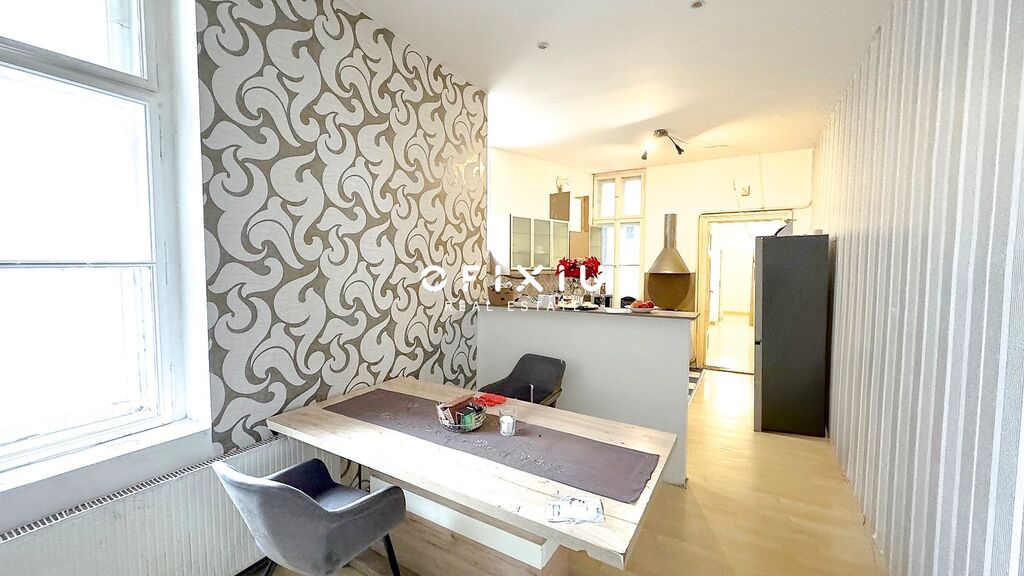 Díky vysokým stropům a velkým oknům působí byt vzdušně a nabízí příjemnou atmosféru historického centra města.
