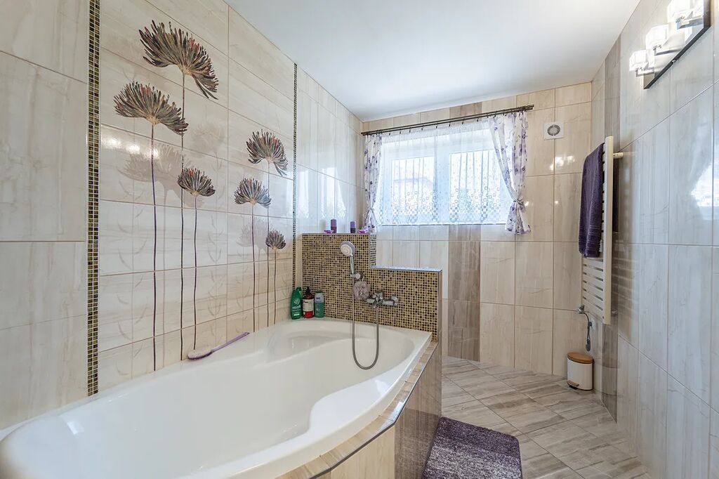 Dům je cihlový (Porotherm) a zateplený (40+10). V domě se nachází prostorná hala se světlovody, které do domu přivádí denní světlo zvenku. Dále pak dispozici tvoří kuchyně s velkým jídelním prostorem, obývací pokoj s velkoformátovými okny, ze kterého je přímý vstup na terasu a zahradu se zapuštěným nevytápěným bazénem 1,5x3x5m. Dům disponuje třemi neprůchozími pokoji, praktickou šatnou a dvěma koupelnami. Jedna koupelna je s vanou a druhá se sprchovým koutem a vstupem na menší terasu s posezením a orientací na východ. Na halu navazuje chodbička do další místnosti, kterou lze využít jako obývací místnost nebo pracovnu, a do technické místnosti, kde se nachází tepelné čerpadlo, zásobník teplé vody, pračka, sušička apod., dále je zde vstup do garáže. V zadní části domu se nachází hlavní vstup do domu a chodbička, ze které vede výsuvný žebřík na pochozí půdu. Dům má okna-trojskla (AR Okenní technika).