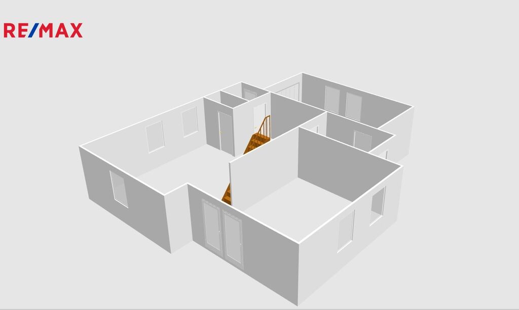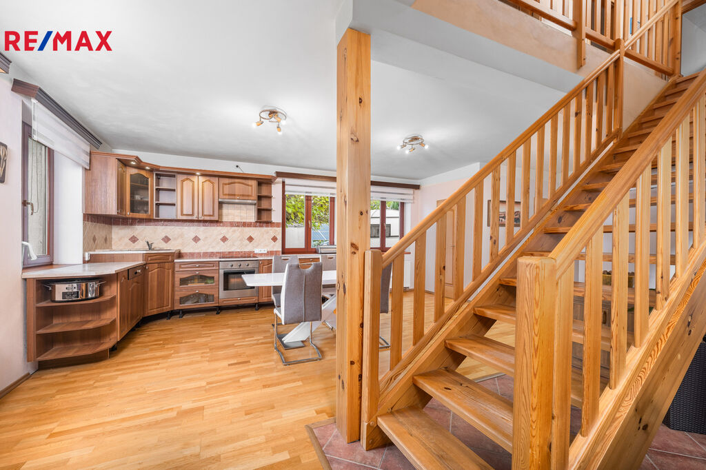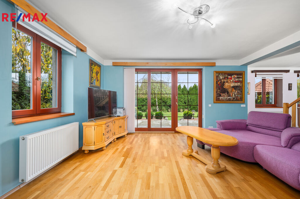 Přízemí: vstupní předsíň, z níž je přístup do garáže i do hlavní obytné části domu. Prostorný obývací pokoj s krbovými kamny je propojen s kuchyní a jídelnou. Dále zde najdete spižírnu a samostatné WC.