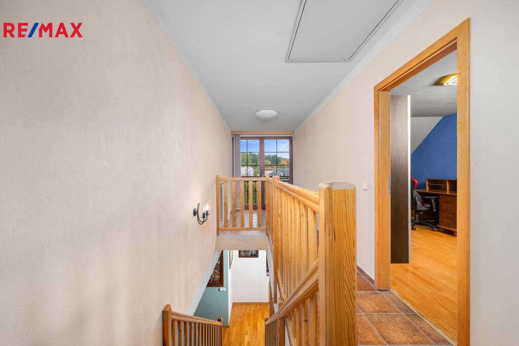 Podkroví: tři samostatné ložnice a velká koupelna s vanou, sprchovým koutem a WC.