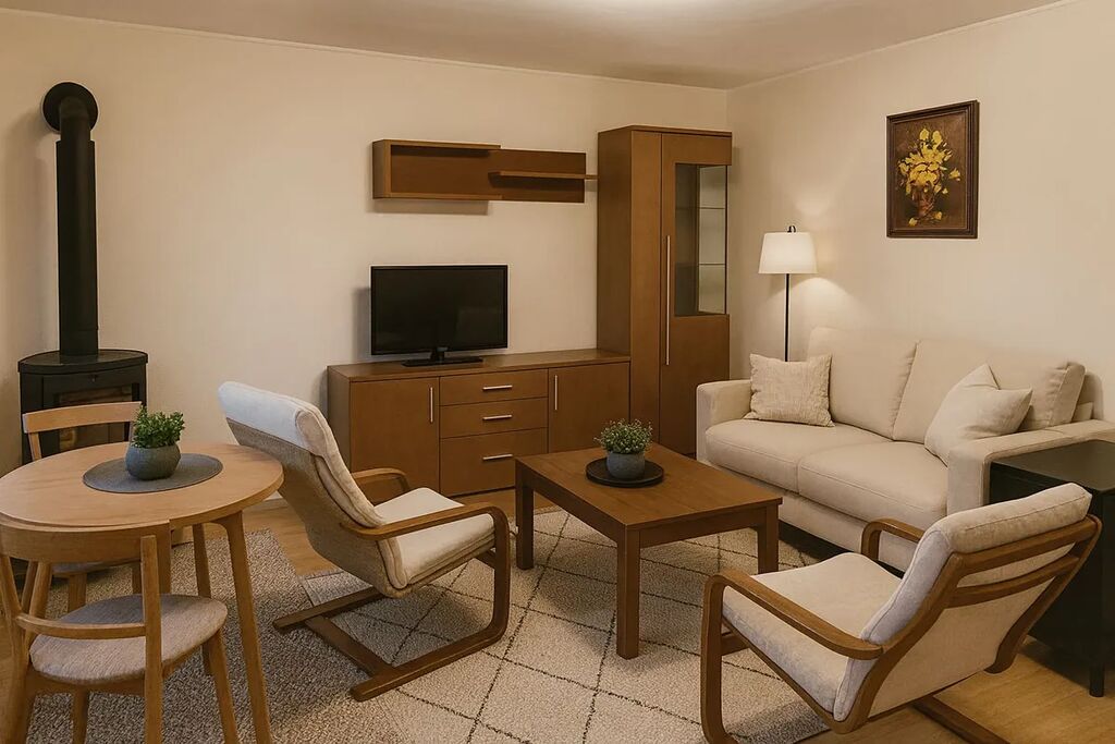 Byt disponuje vlastní terasou a je kompletně zařízen nábytkem i spotřebiči – součástí je TV, hi-fi souprava a plně vybavená kuchyňská linka. Vytápění je kombinované, což zajišťuje komfortní a úsporný provoz.