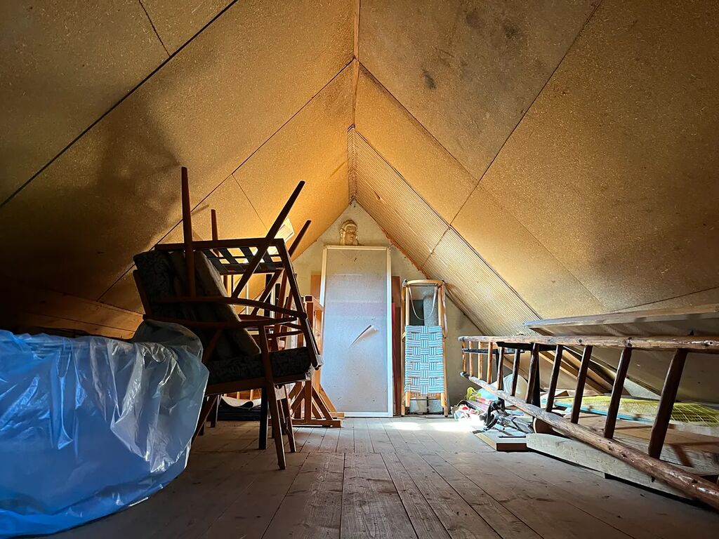 Dispozičně: V přízemí: vstupní zádveří, obývací pokoj s krbovými kachlovými kamny a se vstupem na krytou prostornou slunečnou terasu s průsvitnou střechou a výhledem do zahrady, neprůchozí pokoj - ložnice a samostatná kuchyně s dřevěným schodištěm do obytného podkroví, koupelna s WC + sprchový kout. V patře: 2 neprůchozí pokoje - velká ložnice s balkonem a koutem s umyvadlem + menší neprůchozí dětský pokoj či jako pracovna. Dále se sklopným žebříkem můžeme dostat na půdní úložné prostory. V přízemí je vstup do samostatné komory - sklepa pro uložení zahradní techniky, nářadí či uskladnění ovoce.