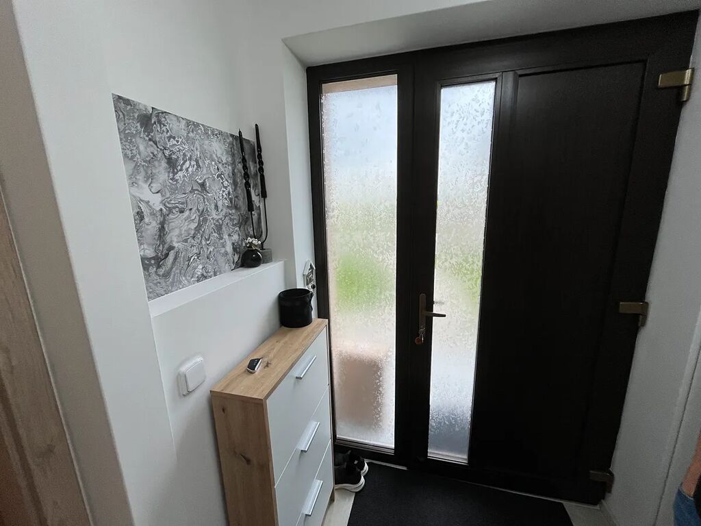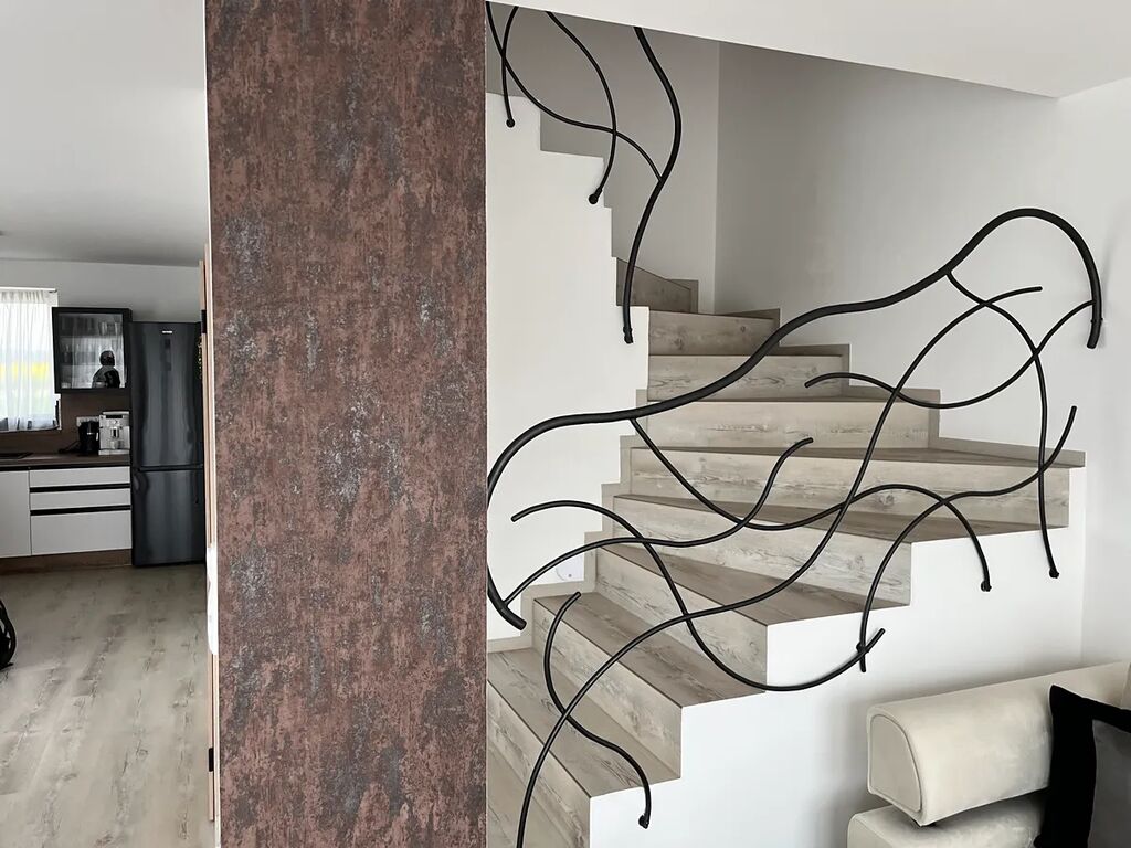 Dispozičně: V přízemí vstupní zádveří, prostorný pokoj s kuchyňským koutem a ostrůvkem, s vestavěnými spotřebiči BOSCH včetně myčky, 2x francouzské dveře do dvora a do zahrady, úložná komora řešena v prostoru pod schodištěm, samostatné WC, technická místnost s kotlem, pračkou a sušičkou. Dále do patra: schodiště s originálním tmavým zábradlím od kováře. V patře: celkem 3 neprůchozí pokoje, ložnice se vstupem na balkon 5 m2 a s vlastní šatnou, orientováno na východ, na druhé straně menší chodby 2 dětské neprůchozí pokoje ( nebo pokoj a pracovna) orientovány na západ ven s vyhlídkou ven z obce, koupelna se sprchovým koutem. Sklopný žebřík na půdní prostor.