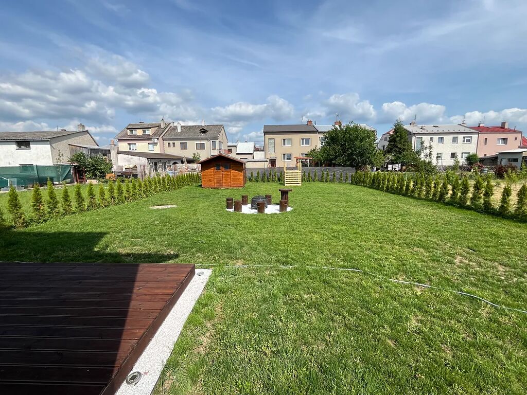 V přízemní východní části domu je venku za obývacím pokojem umístěna prostorná dřevěná terasa s výhledem do zeleně zahrady ve středu s ohništěm. Na konci zahrady se nachází útulný dřevěný zahradní domek, zahradu po obvodě ohraničují malé túje, které zahradě do budoucna zajistí slušné soukromí. Dům je obklopen chodníkem a parkovacími stáními se zámkovou dlažbou.