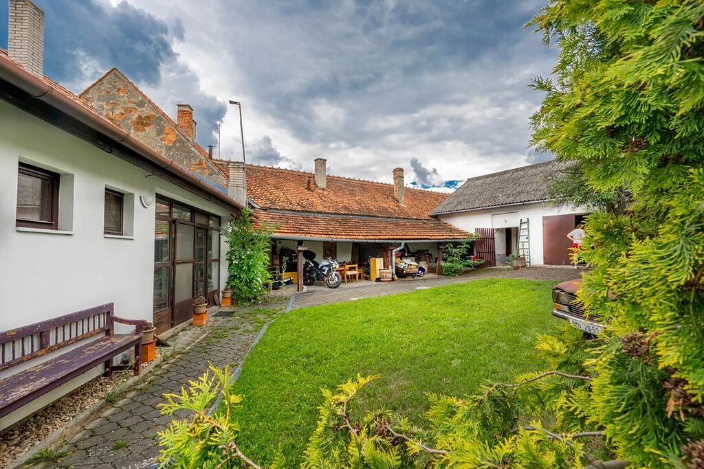 Součástí domu je garáž ve dvoře, sklep ideální pro uskladnění vína a zachovalá stodola, která může posloužit jako základ pro rozšíření obytné části. Na pozemku se nachází zastřešené venkovní posezení a pečlivě udržovaná zahrada, která nabízí dostatek soukromí i prostoru pro odpočinek. Dům disponuje velkým množstvím úložného prostoru a nabízí možnost půdní vestavby.