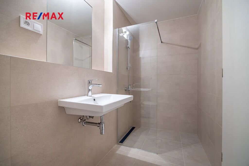 Koupelna působí elegantně díky velkoformátové dlažbě a moderní sanitě, samozřejmostí je příprava na pračku.