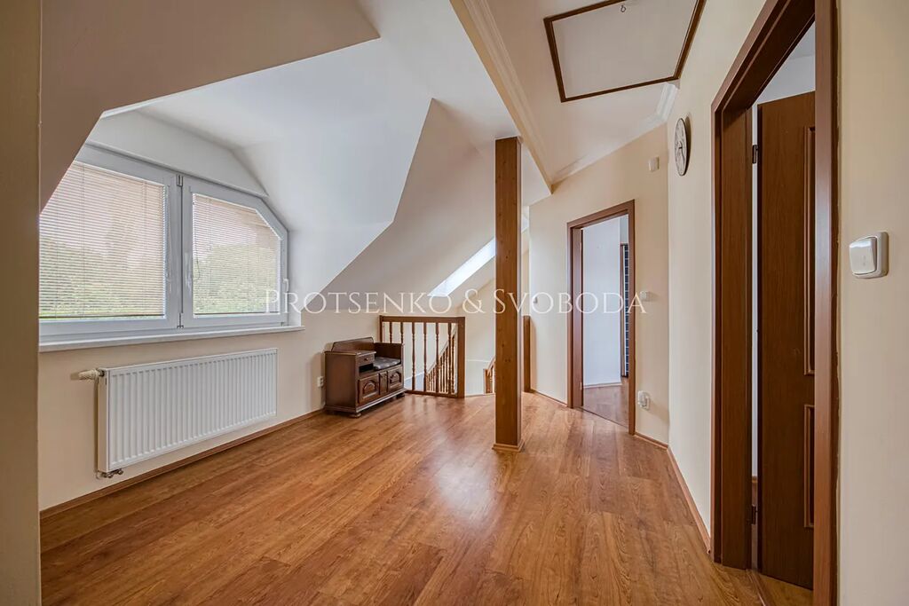V podkroví se pak nachází galerie, hlavní ložnice se šatnou a balkonem, dva dětské pokoje, pracovna, koupelna s vanou i sprchovým koutem, WC a další komora.