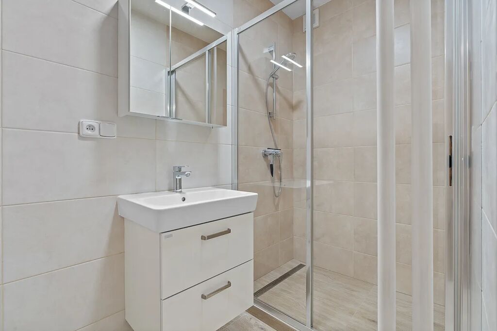 Byt se nachází v 2.NP bez výtahu. Je zde kuchyně se spotřebiči, průchozí obývací pokoj, dále koupelna se sprchovým koutem, umyvadlem a samostatné WC.