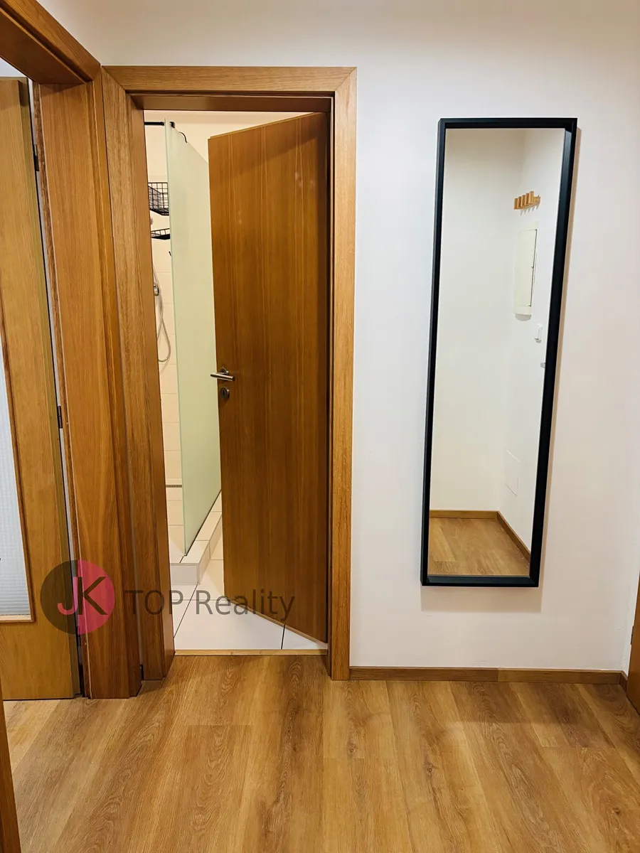Byt je částečně zařízený – kuchyňská linka na míru s vestavěnými spotřebiči (indukční varná deska, el. trouba, digestoř, myčka na nádobí, lednice s mrazákem). V koupelně velký sprchový kout, zrcadlo, koupelnové skříňka a WC. V ložnici je šatní skříň a pracovní stůl se židlí.
