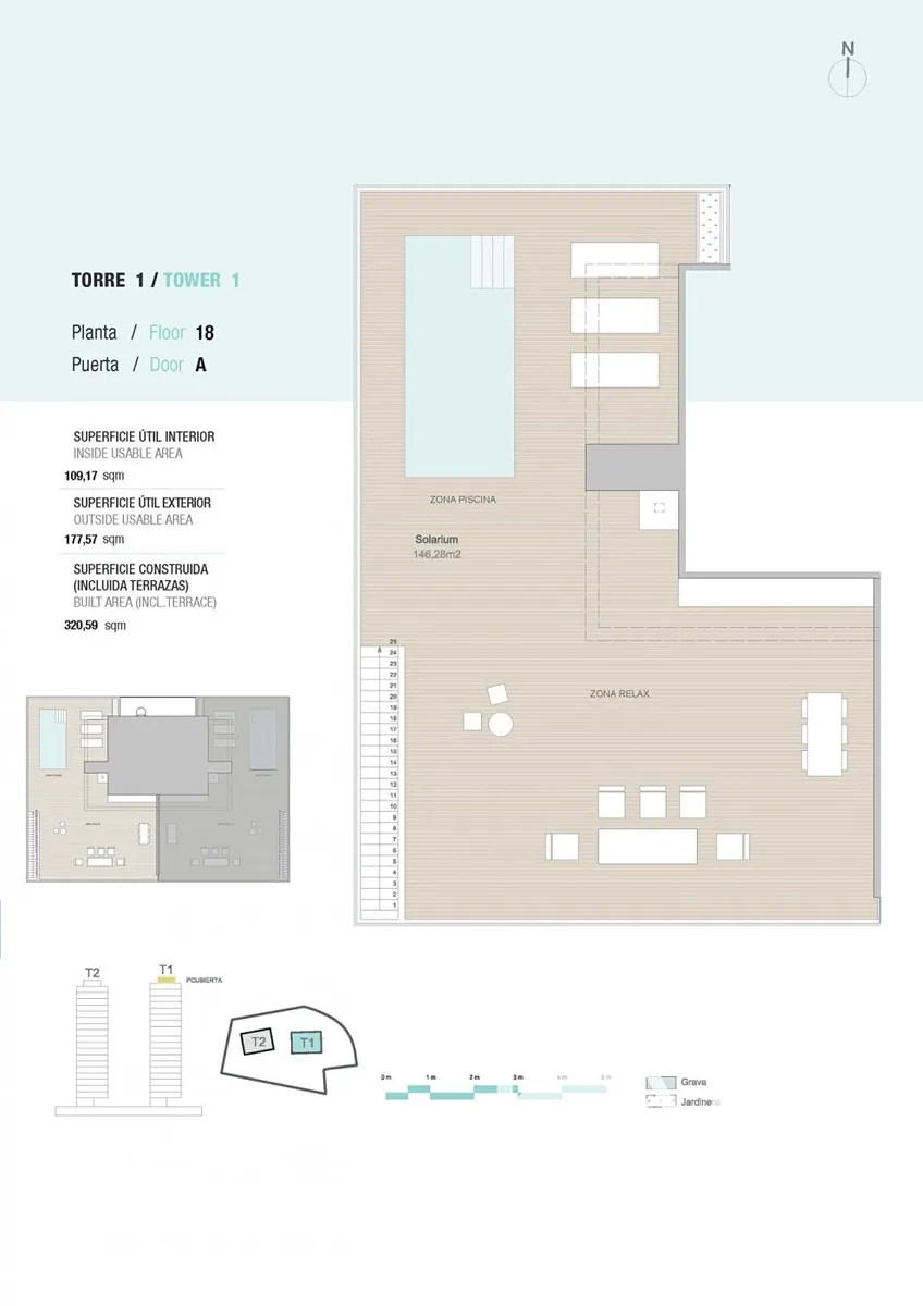 Komplex tvoří dvě elegantní osmnáctipatrové věže s rozsáhlými společnými prostory, které poskytují vše, co si moderní člověk přeje. K dispozici jsou udržované zahrady, bazén, dětská zóna, kurty na paddle tenis a fitness centrum. Na 11. patře první věže se nachází exkluzivní infinity bazén, sauna a odpočinková chill-out zóna s nádherným výhledem na Středozemní moře.