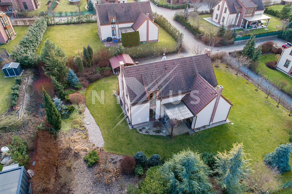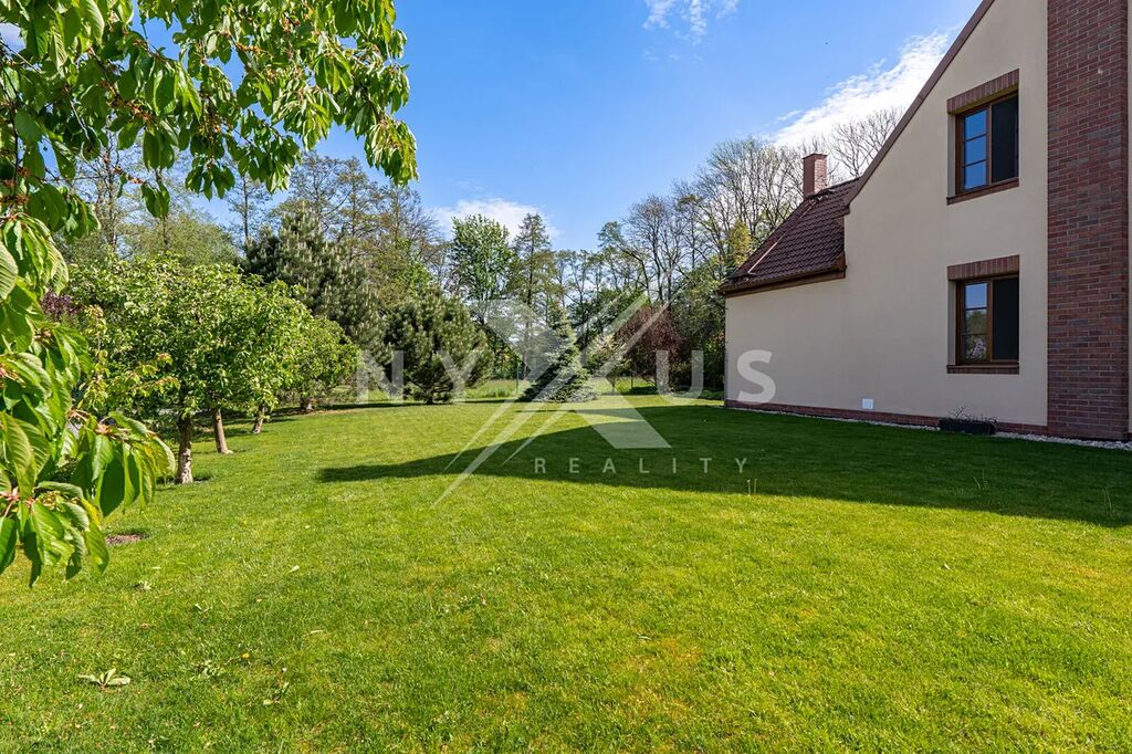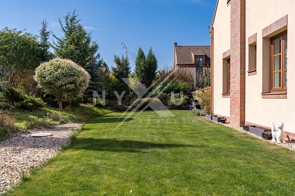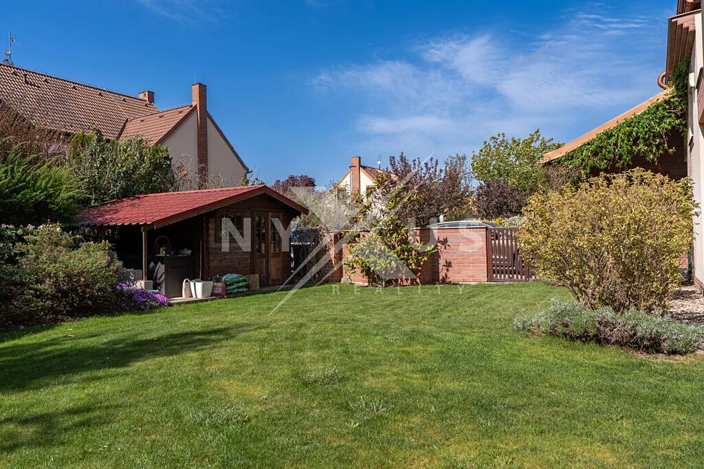 Elegantní dvoupodlažní dům v anglickém stylu stojí uprostřed rovné zahrady se vzrostlými stromy a keři, nechybí ani různé druhy těch ovocných. Pěstěný trávník udržuje automatická závlaha, zahradní technika je uskladněna v samostatném zahradním domku. Velký pozemek nabízí mnoho dalších využití, jako je například vybudování zimní zahrady, sauny, bazénu či rozšíření domu.