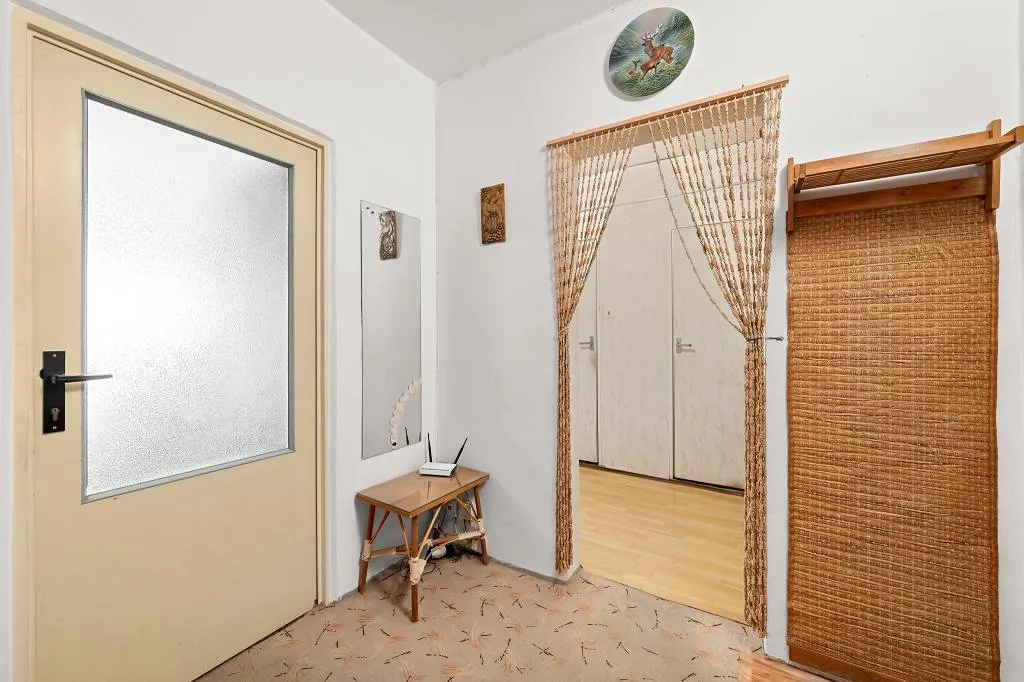 Disponuje velkou předsíní do tvaru písmene L, odkud je z její jedné části vstup do prostorného obývacího pokoje se vstupem na zasklený balkon, dále je zde vstup do pokoje využívaného jako ložnice, také do dalšího pokoje a to pracovny. Z druhé části předsíně je vstup do koupelny, WC a kuchyně.