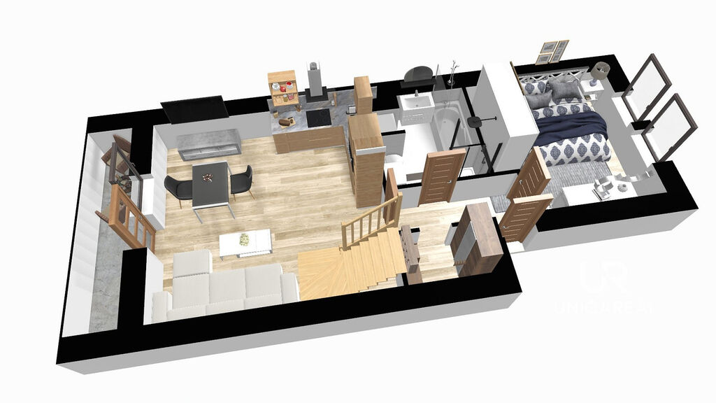 •	Ze vstupní chodby je vpravo ložnice, vlevo kuchyňský kout propojený s obývacím pokojem, ze kterého je vstup
