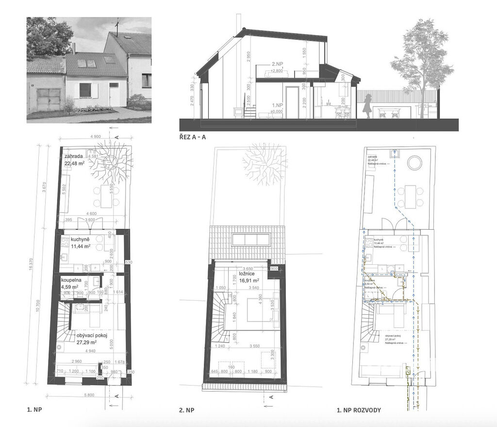 Dům je již napojen na elektřinu, vodovod i kanalizaci. V přiložené galerii naleznete vizualizace a půdorysy finální podoby domu po rekonstrukci.