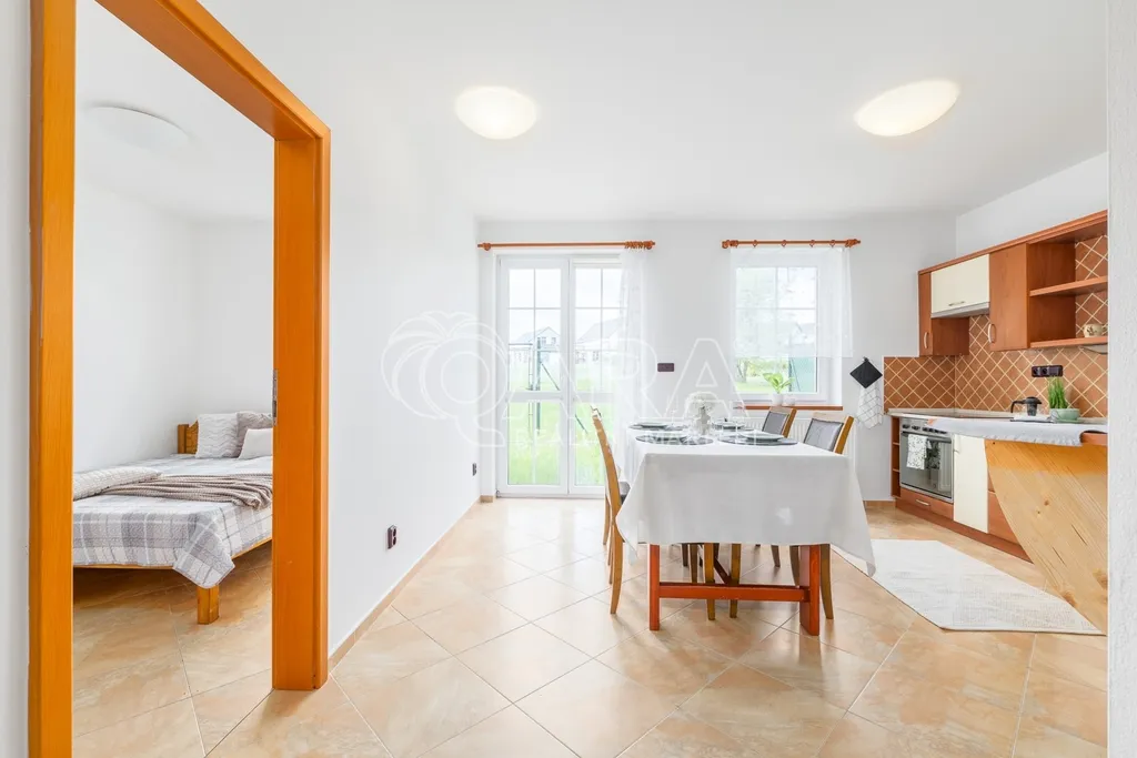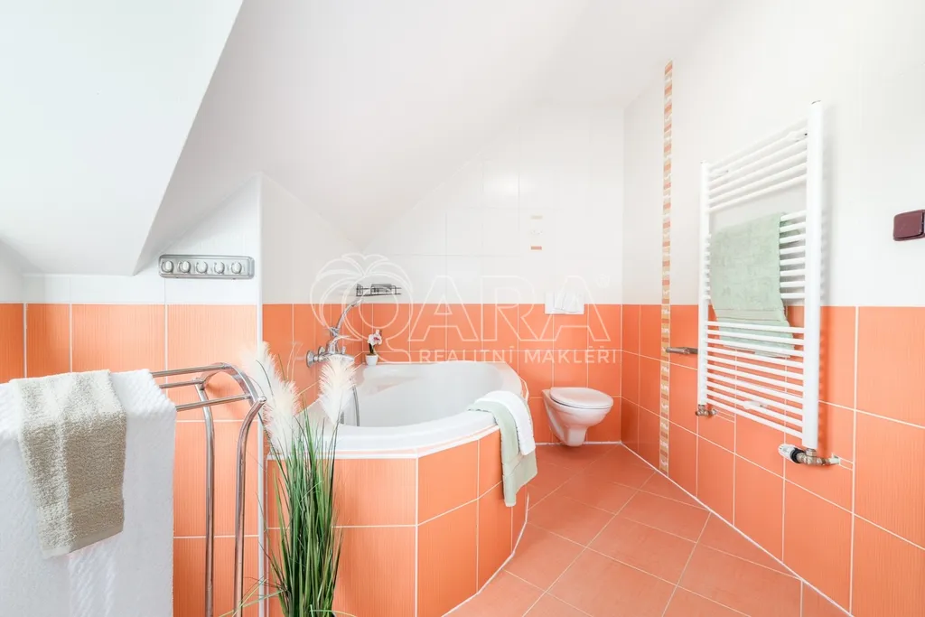 Dům jako takový poskytuje užitnou plochu o necelých 120 m² a je součástí řadového rodinného bloku. Nabízí pět obytných pokojů, dvě koupelny, prostorný obývací pokoj s kuchyní a jídelnou, technické komory a spíž. Vzdušný obývací pokoj doplňuje přímý vstup na zastřešenou terasu o výměře 14,5 m², ideální pro posezení a grilování. Z kuchyně je vstup přímo na zahradu náležící k domu o příjemné výměře 370 m², která poskytuje ideální klidné prostředí pro relaxaci nebo místo, kde se mohou děti bezpečně vydovádět. K praktičnosti domu přispívá také vlastní přístřešek na auto a zděný zahradní domek či skladovací místnost vhodná pro uložení sportovního vybavení nebo zahradní techniky. V případě potřeby dalších parkovacích míst je možné po domluvě dokoupit volná stání před domem.