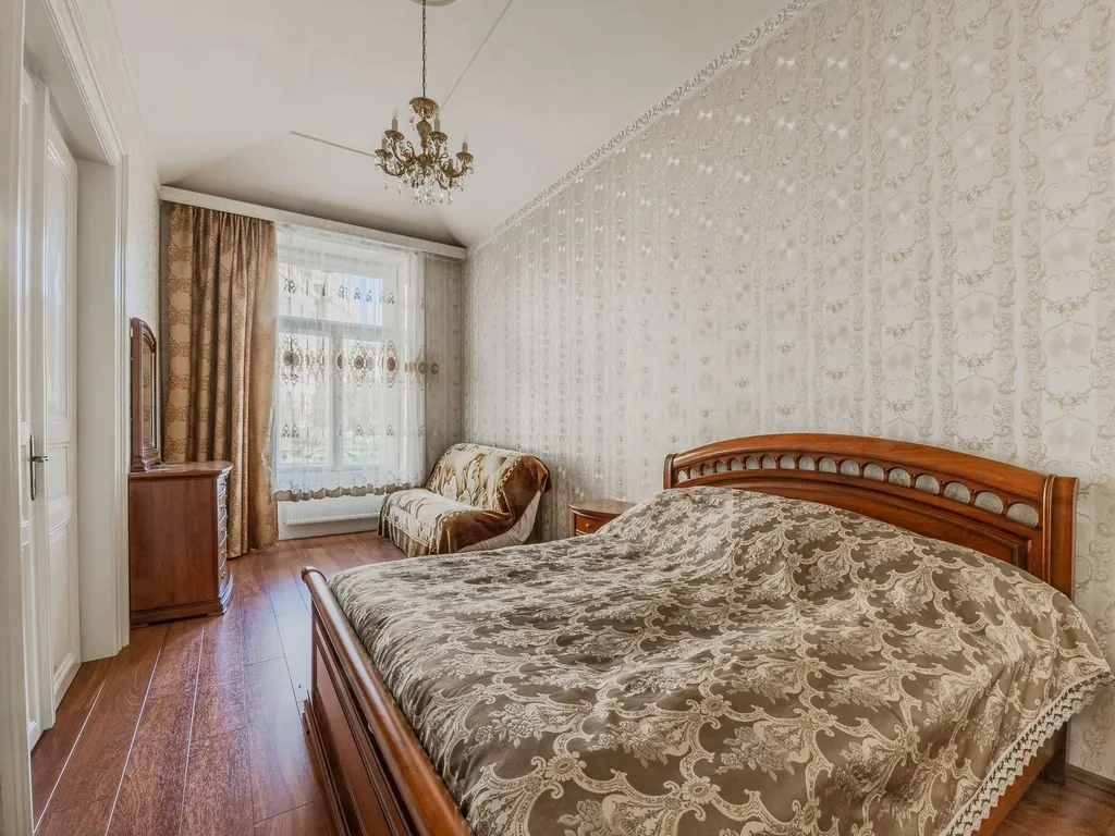 • Reprezentativní obývací pokoj s krbem, dekorativními stropy a přímým východním výhledem na budovu Národního muzea.