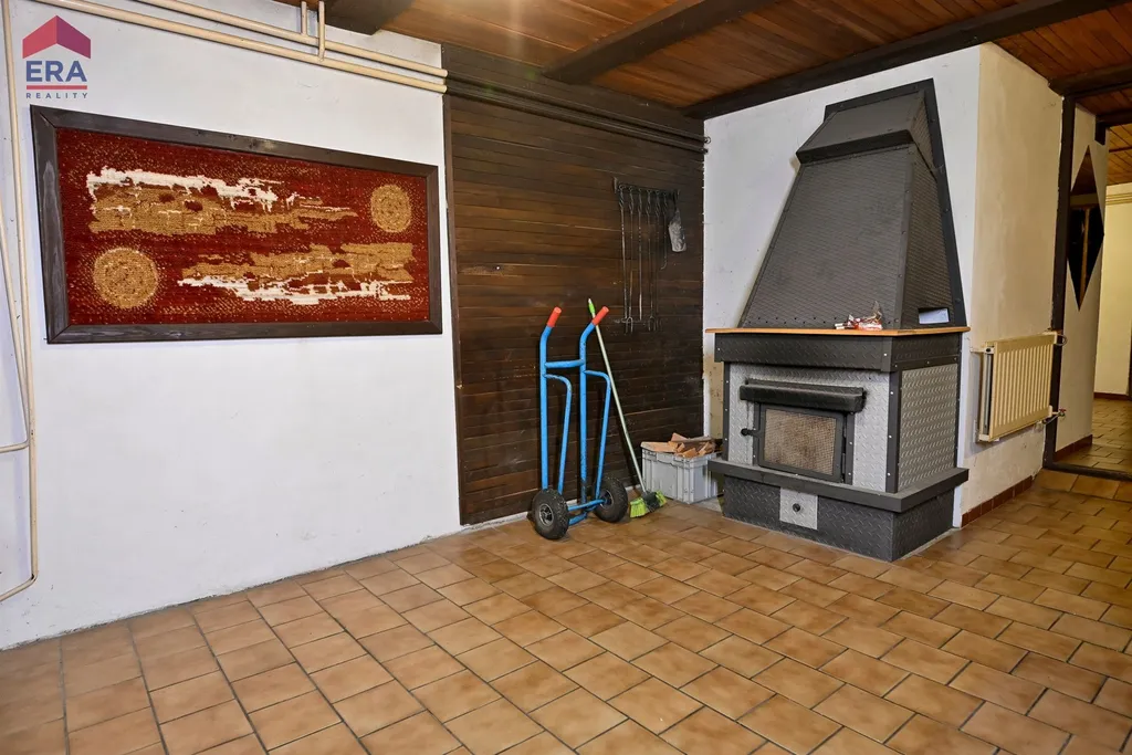 Dispozice domu : přízemí vstupní hala s krbem, sklep, WC , sprcha, prostor pro saunu, garáž , dílna, kotelna ( el.boiler, plyn.kotel)