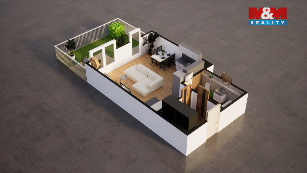 Byt disponuje užitnou plochou 45,9 m². Oplocenou předzahrádku o rozloze 30 m² oceníte hlavně v teplých měsících, kdy si zde můžete dopřát klidný večer se sklenkou dobrého vína.