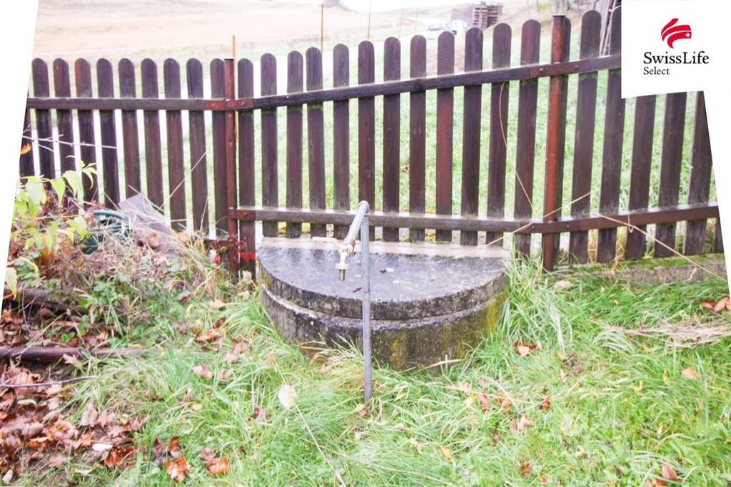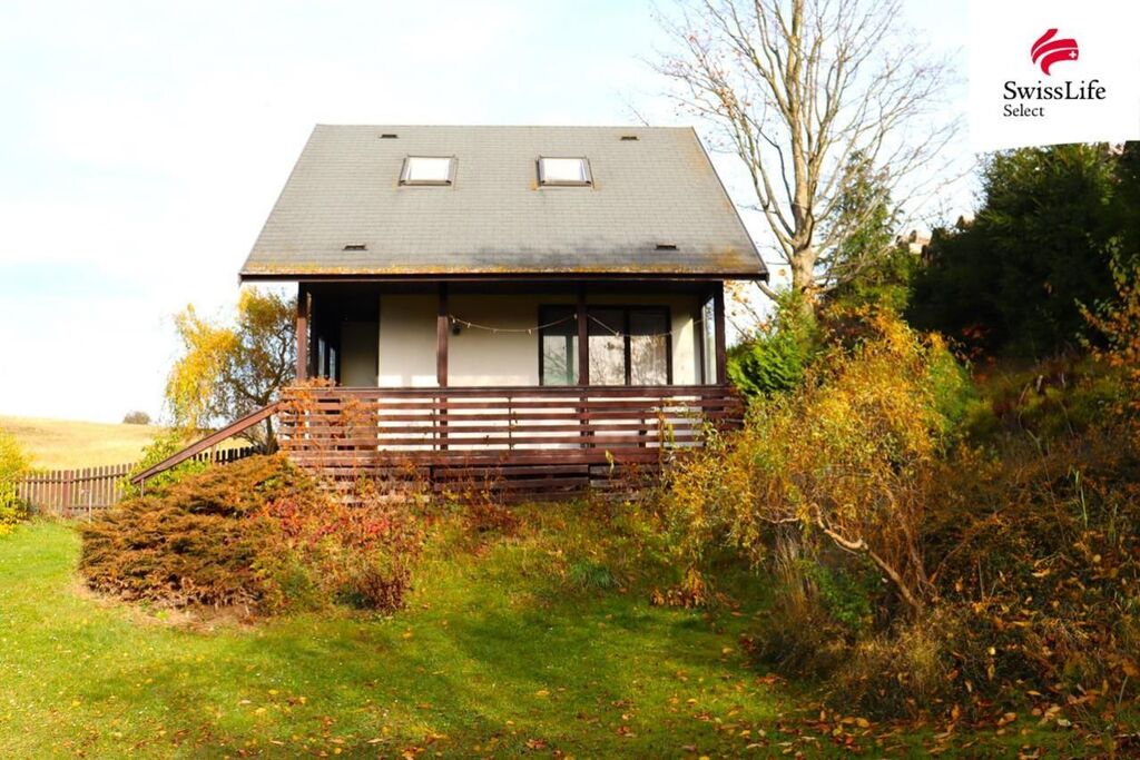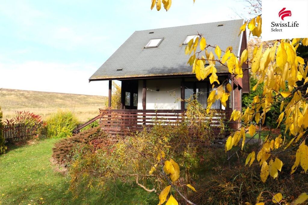 Exteriér: Z chaty vedou dveře na venkovní terasu s krásným výhledem do okolní krajiny. Na chatu navazuje dřevěná přístavba, která slouží jako praktický sklad. Na pozemku je studna.