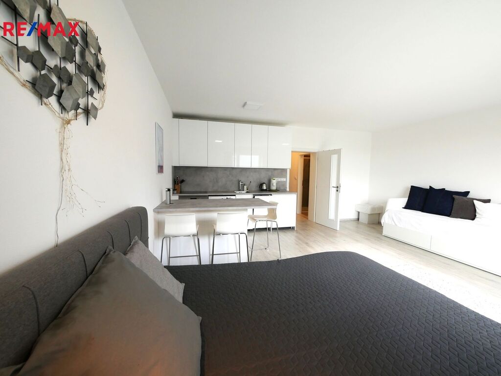 Plně vybavená kuchyňská linka s indukční deskou, elektrickou troubou spojenou s mikrovlnným ohřevem, myčkou a lednicí s mrazákem zajišťuje absolutní komfort. V rámci kuchyňské linky je umístěna i pračka. Byt je kromě kuchyňské linky i částečně zařízen barovým pultem, rozkládací sedačkou a dvoulůžkem.