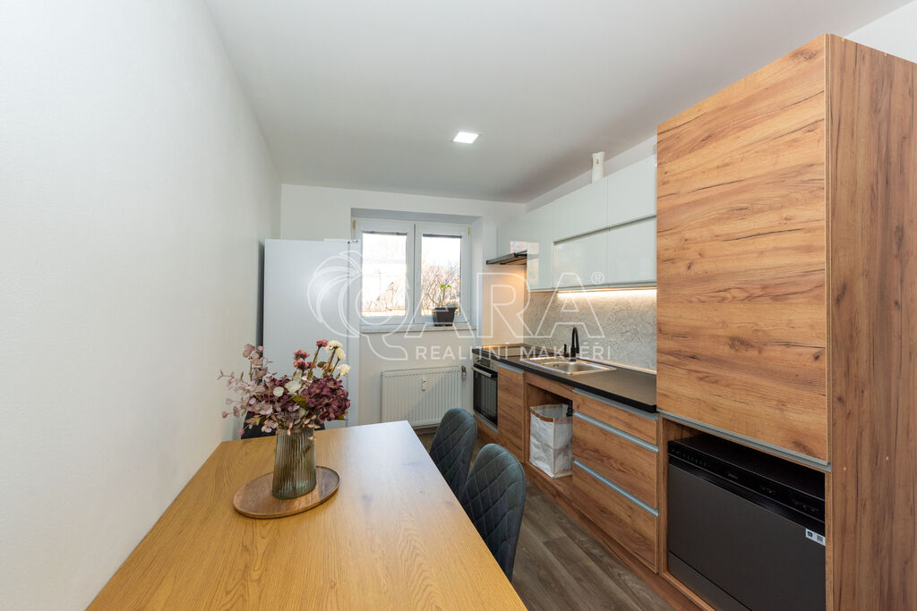 Byt se skládá z obývacího pokoje, ložnice, prostorné kuchyně, koupelny s WC a útulné předsíně. K bytu náleží dva sklepy, které poskytují dostatek úložného prostoru.