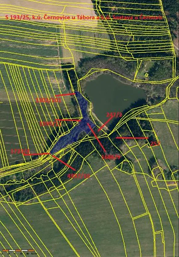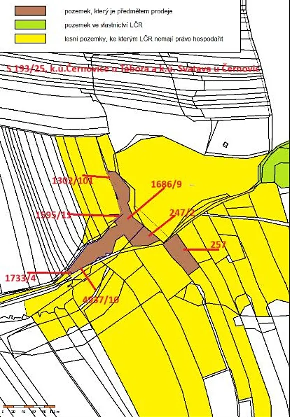 Jedná se o prodej 3 lesních pozemků v k.ú. Černovice u Tábora (p.č. 1302/101, p.č. 1595/11, p.č. 1686/9), dále 2 pozemků ostatní plochy v k.ú. Černovice u Tábora (p.č. 1733/4, p.č. 4937/10) a 2 lesních pozemků v k.ú. Svatava u Černovic (p.č. 247/2 a p.č. 257), nacházejících se východně od obce Černovice vedle rybníka Váberov, obklopených pozemky jiných vlastníků, špatně přístupné a roste na nich mladý smíšený les.