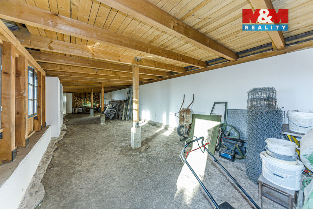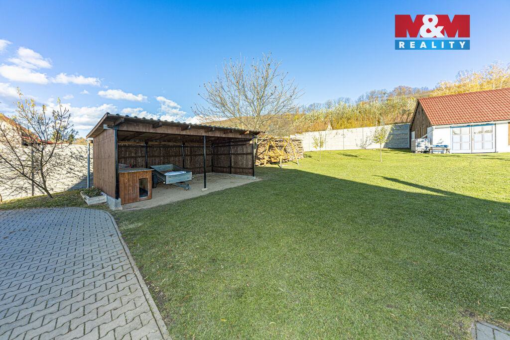 K domu náleží pozemek o rozloze 1300 m², garáž, dřevník a stodola .