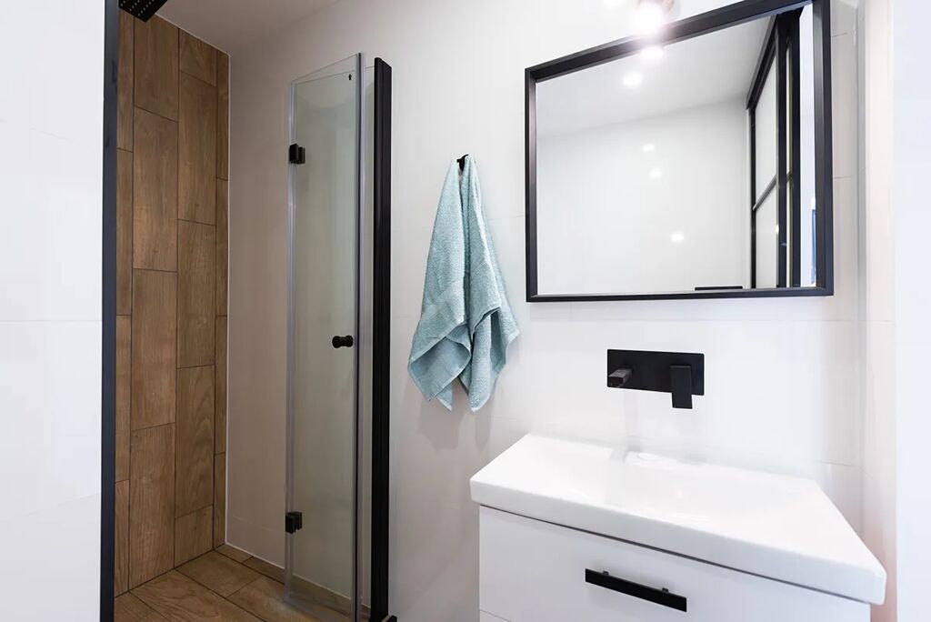 Koupelna prošla stejně pečlivou rekonstrukcí jako zbytek bytu – kombinuje nadčasovou jednoduchost a praktické řešení. Dominují jí velkoformátové obklady, imitace dřeva na podlaze, sprchový kout se systémem dešťové sprchy, podomítkové baterie.Toaleta je značky Geberit, nechybí úsporné posuvné skleněné dveře.