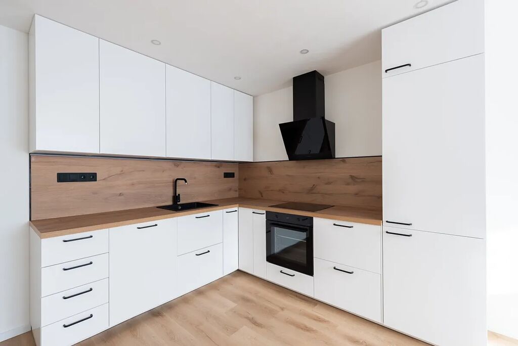 Obývací pokoj s kuchyňským koutem tvoří srdce celého bytu. Elegantní kuchyňská linka v kombinaci světlého dřeva a bílých ploch je vybavena kompletní sadou vestavných spotřebičů: troubou, indukční varnou deskou, digestoří, myčkou, lednicí s mrazákem. Velkorysá pracovní deska, dostatek úložných prostor a praktické rozmístění spotřebičů dávají kuchyni příjemnou funkčnost i styl.