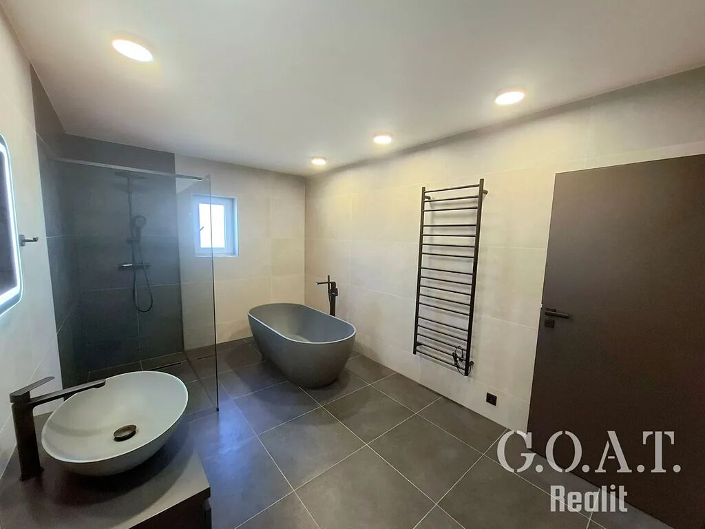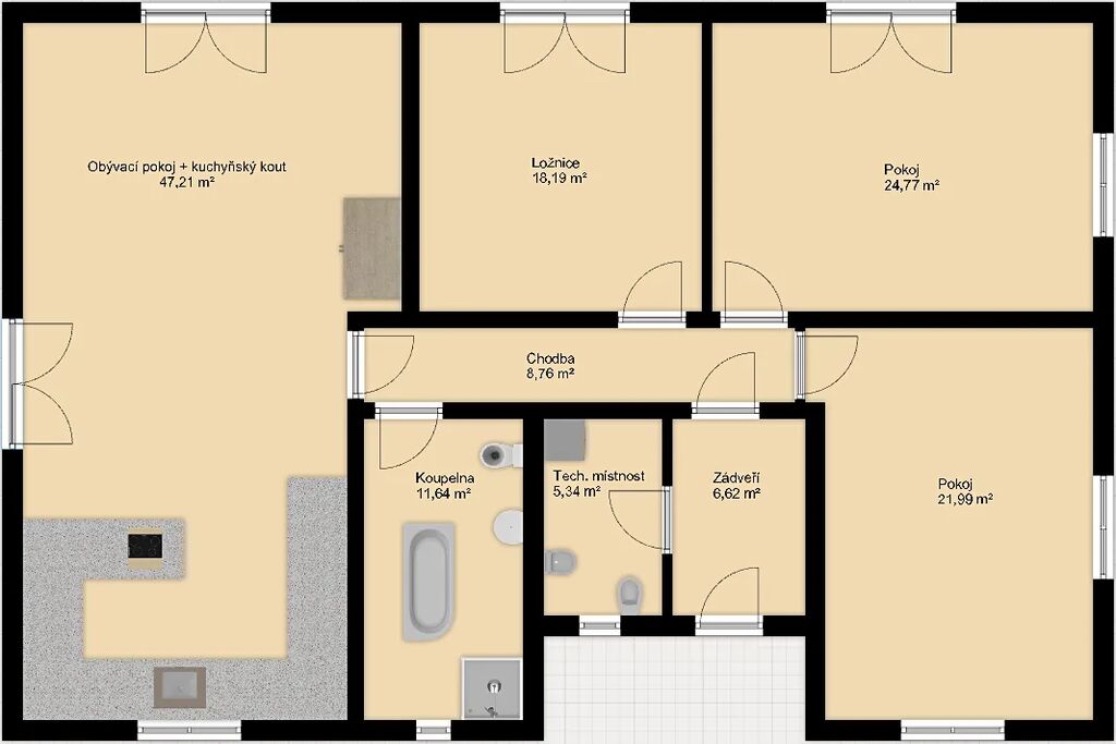 Koupelna nabízí jak sprchový kout, tak volně stojící vanu, dále toaletu a umyvadlo. Dispozice domu zahrnuje obývací pokoj s kuchyňským koutem o ploše 47 m², ložnici 18 m², dva další pokoje o velikosti 25 m² a 22 m², prostornou koupelnu, technickou místnost, chodbu a zádveří.