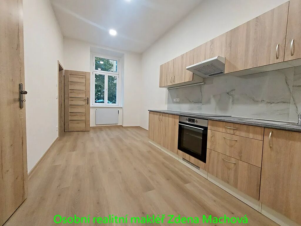 Uvnitř bytu v kuchyni najdete novou kuchyňskou linku, vchod do koupelny se sprchovým koutem, bojlerem a místem pro pračku, a prostorný vedlejší pokoj s vysokými stropy a velkými okny do ulice.