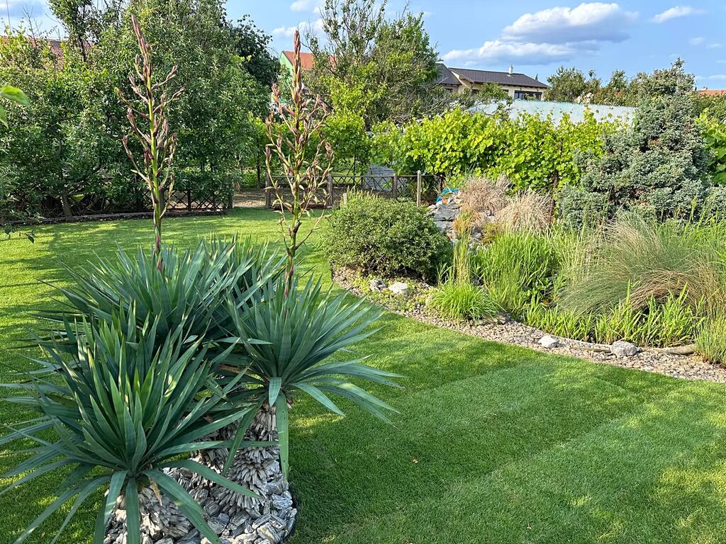 Za domem je zcela uzavřený dvůr s novou WPC terasou s udírnou, dvůr je okrasně upraven. Za dvorem je krásná okrasná zahrada s posezením, druhou (menší) zděnou udírnou, okrasným jezírkem se skalkovou kaskádou a po obvodu s ovocnými stromy a vinnou révou.