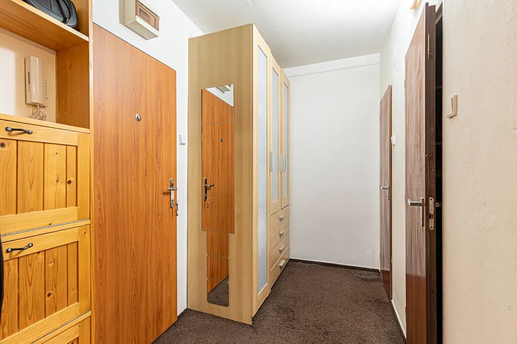 Mám pro vás prostornou bytovou jednotku o dispozici 1+1. Byt je v osobním vlastnictví a nachází se v centru města v 6. patře panelového domu s výtahem. Byt je vybaven nábytkem který vidíte na fotkách včetně ledničky a pračky. Pro komfortní bydlení v bytě jsou venkovní žaluzie pro regulaci slunečního světla a soukromí. K bytu patří malý balkon na společné chodbě a sklep, který se nachází v suterénu domu.
