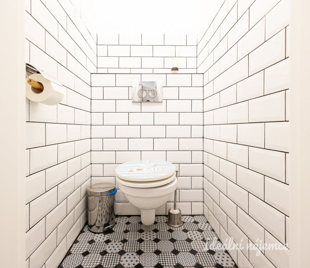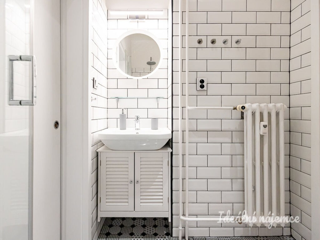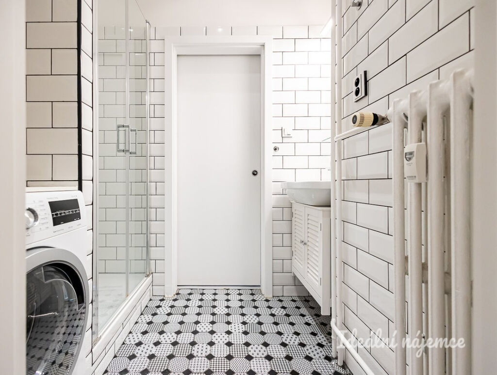 Z koupelny lze vejít jak do ložnice, tak i do obývacího pokoje. Je zařízena sprchovým koutem, pračkou a umyvadlem.