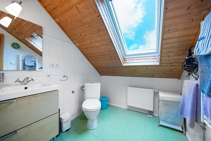 - Dispozice 5+kk, přízemí: vstup, technická místnost, WC pro hosty, vstup do jídelny a kuchyně, která je z části propojená s prostorným obývacím pokojem a vstupem na zastřešenou terasu s venkovním sezením , ložnice (pokoj pro hosty), koupelna, schodiště do patra : chodba, ložnice, dětský pokoj s půdičkou (možnost spaní), pracovna ( dětský pokoj), koupelna s WC.